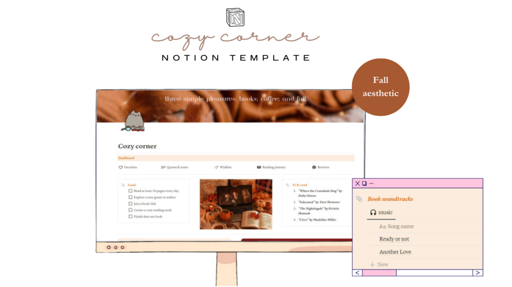 Welcome to Cozy corner Notion template! 📖💕This is a cozy, book-lover's template, making reading even more enjoyable and organized.