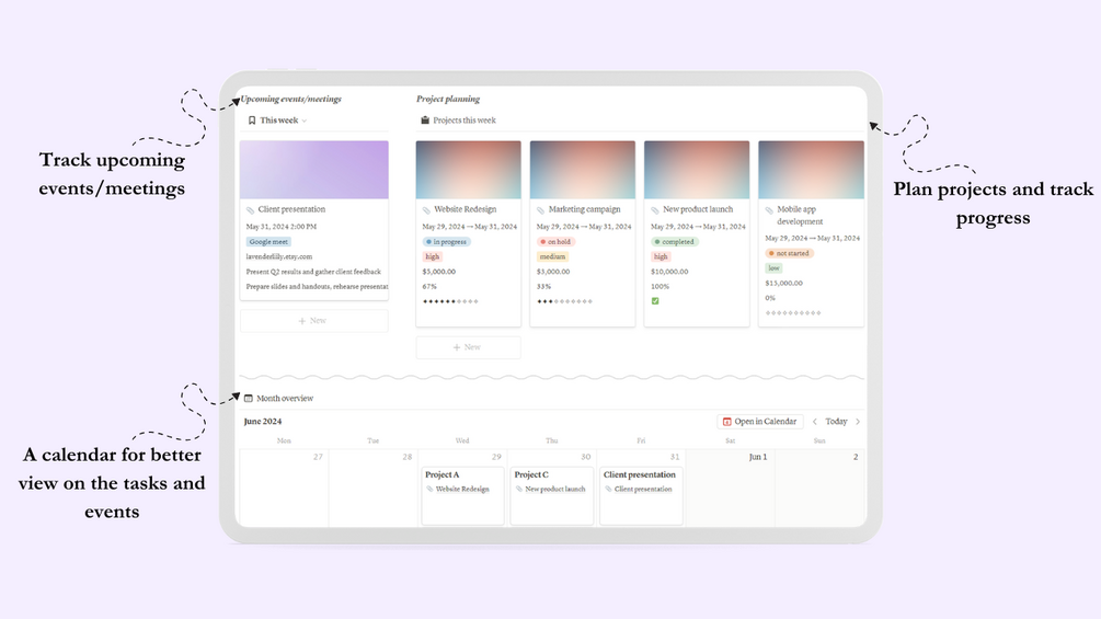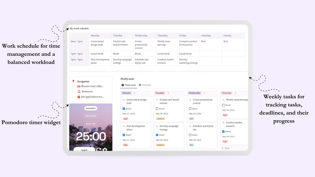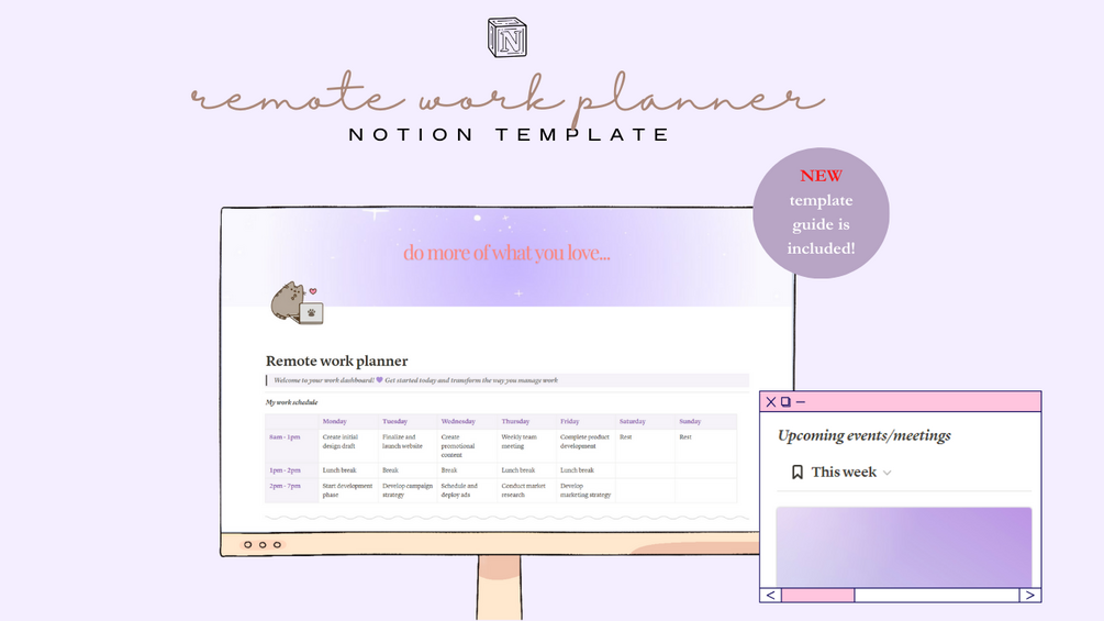 Welcome to Remote work planner Notion tempate! 💜 If you are a remote team worker and want to stay organized, productive, and efficient then this template is for you