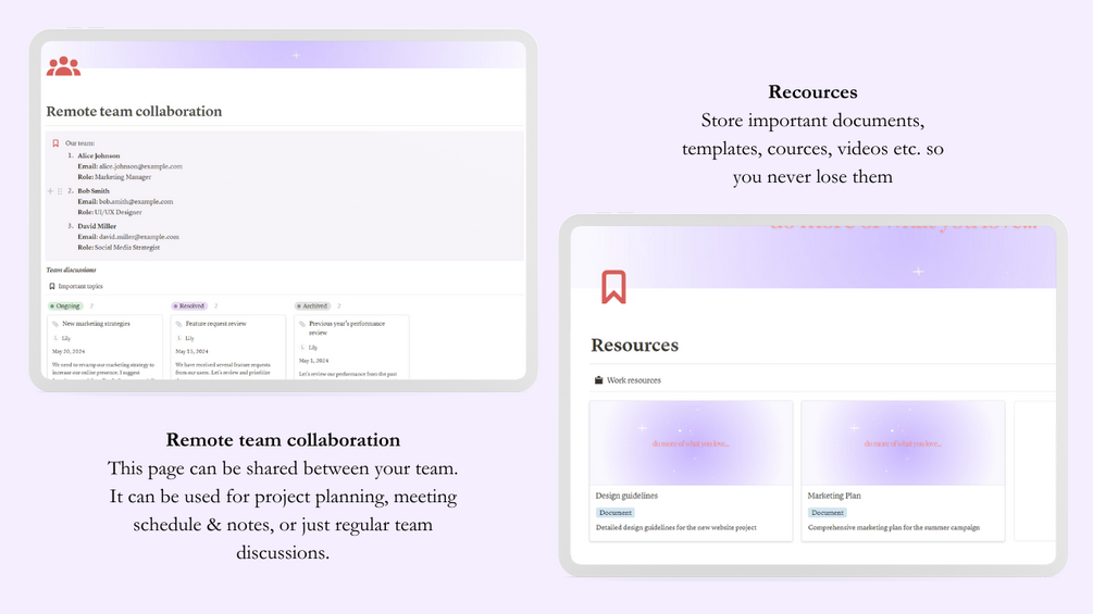 Welcome to Remote work planner Notion tempate! 💜 If you are a remote team worker and want to stay organized, productive, and efficient then this template is for you